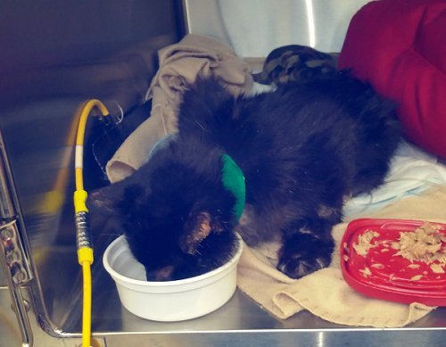 When I began to pick her up to place in the box I’d found, she cried and moved. By the time we got to the hospital, her blood sugar was so low that it was unmeasurable. The night-duty doctor and the technicians in the ICU put her on a fluid drip and oxygen. Yoko was not available for the ICU on the day after Spider’s readmission. Lesli took charge of her care. Once again, Spider found a wonderful doctor.