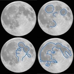 Why do people see different images (the Man, Woman, and Rabbit are just the most obvious ones) in light and dark areas on the surface of our nearest celestial neighbor? The most likely reason is that we are taught. General pareidolia may be an innate ability of humans and other primates, but what you see is a function of somebody’s imagination. I vaguely remember someone (either my father or grandfather) showing me how to see the “Man in the Moon”. I recall seeing the picture with the “Rabbit” outlined sometime in the fairly recent (20-30 years) past. I never saw the “Woman in the Moon” until I found this picture. Now, I’m sure I’ll see her the next time I look at a full Moon.