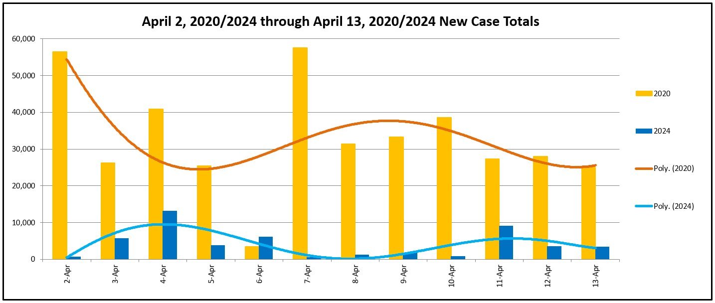Whether April 6th in 2020 and 2024 represent a statistical anomaly or a real difference in the number of new cases, the other 11 days show a dramatic difference … by tens of thousands … between 2020 and 2024.