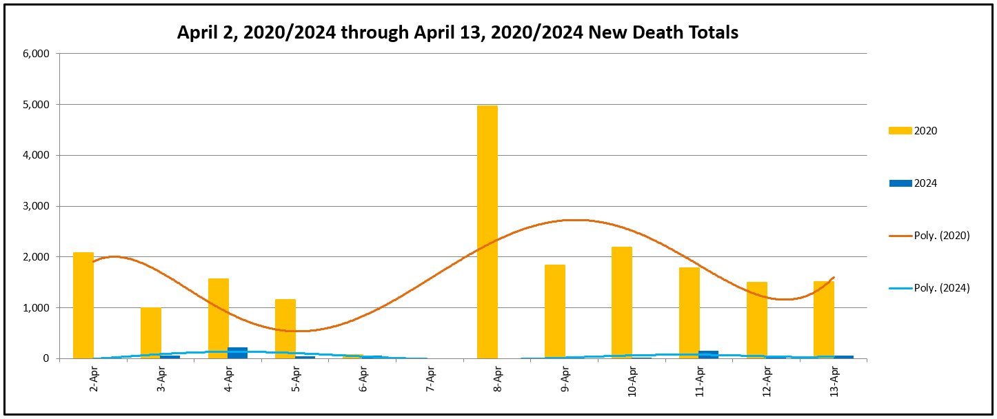 The new deaths chart shows an even more dramatic difference between 2020 and 2024. Once again, April 6th has a very low value in both years … and is joined by April 7th. What is most obvious is that the 2024 numbers are extremely low. Between the vaccines and annual boosters, Paxlovid and other treatments, and a more informed public, we have come a long way between 2020 and 2024.