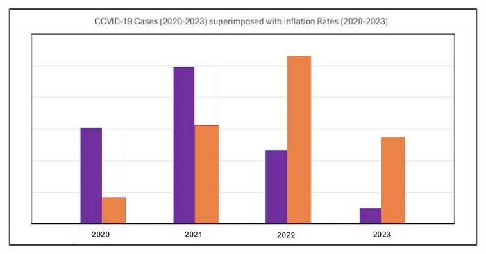 The purple bars represent each year’s COVID-19 Cases. The orange bars represent each year’s Inflation Rate on December 31st.