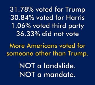I attempted to check the numbers, but couldn’t find a specific count of the number of U.S. citizens who were eligible to vote in 2024. I did find one for 2023. Using that denominator and actual counts of votes cast in the 2024 election, I calculated percentages that were quite close to the ones in the meme. If the picture’s values aren’t absolutely accurate, they’re pretty darn close.